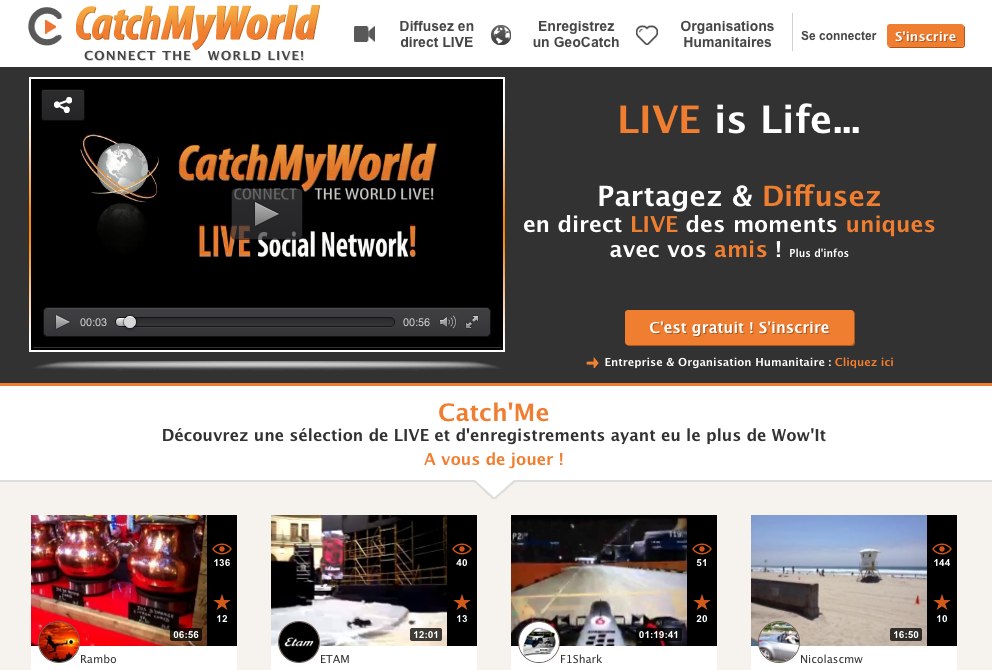 Catch My World est une nouvelle plateforme imaginée pour donner la possibilité à chacun de nous, de filmer et de diffuser en live tout ce que l’on souhaite. Chacun devient éditeur de contenus live et diffuseur via la plateforme sociale.