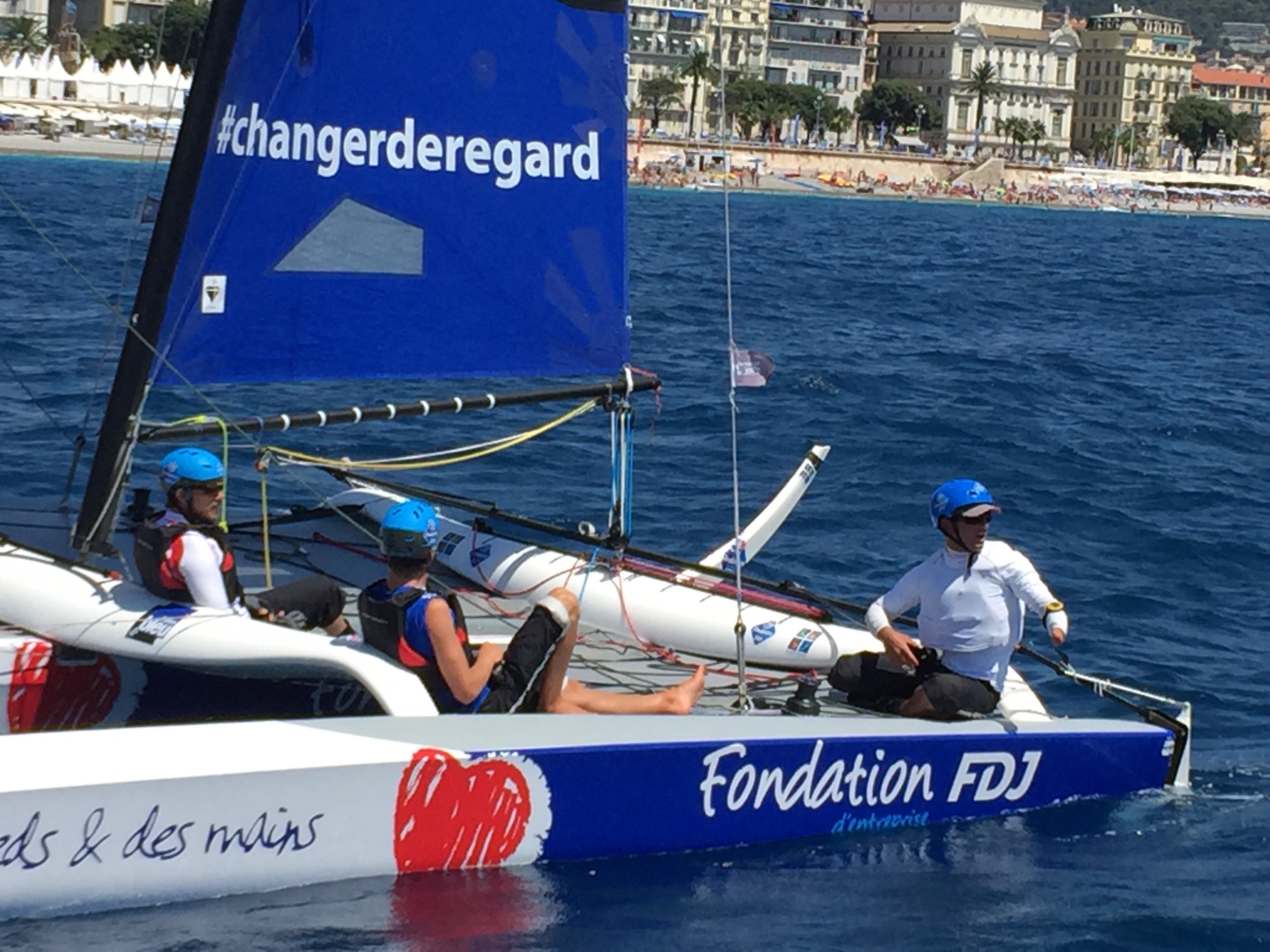 Grosses émotions, plus tard, revenus au PC course lorsqu’on apprend qu’un cameraman est tombé à la mer et qu’un bateau s’est retourné et a cassé son mât. C’est vrai qu’on se faisait déjà bien bouger sur notre bateau suiveur ! On est bien aussi sur terre, le lot de la promenade des Anglais pour suivre les derniers bords avant la remise des trophées en fin d’après-midi. bravo à Spindrift qui gagne ce tour de France à la voile nouvelle formule et merci la FDJ !
